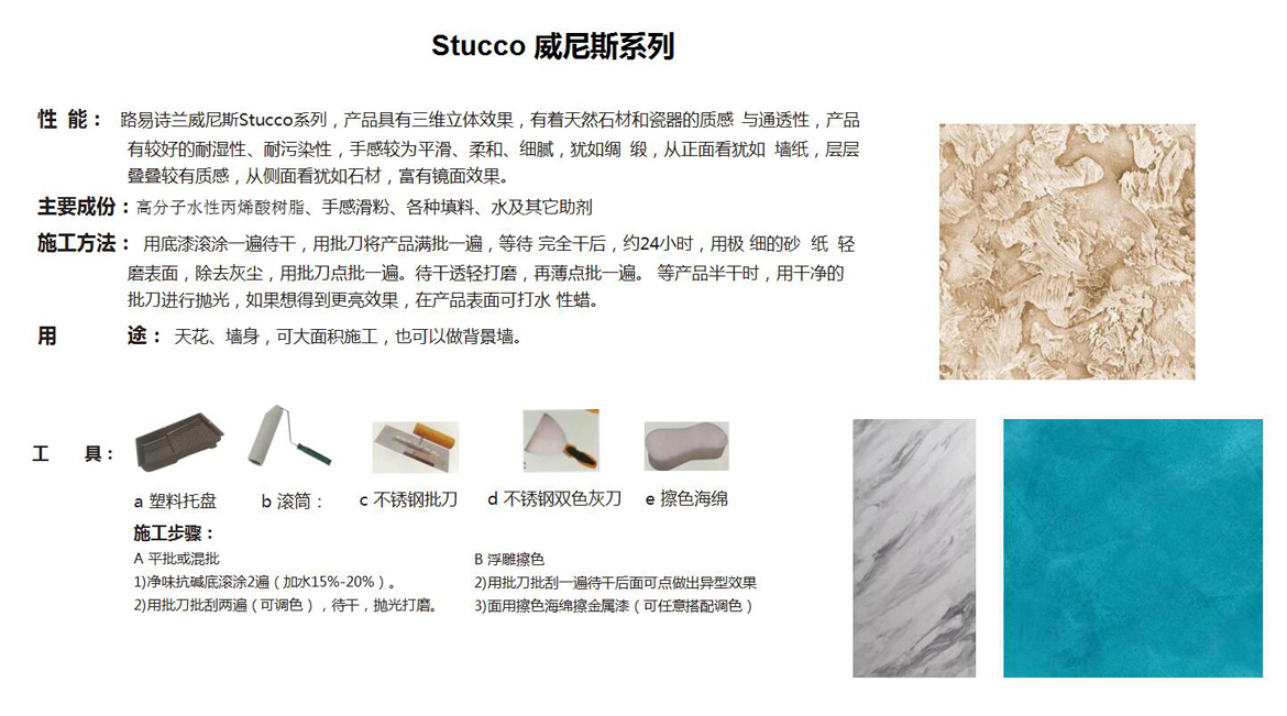 路易诗兰威尼斯Stucco系列,产品具有三维立体效果,有着天然石材和瓷器的质感 与通透性,产品有较好的耐湿性、耐污染性,手感较为平滑、柔和、细腻,犹如绸 缎,从正面看犹如 墙纸,层层叠叠较有质感,从侧面看犹如石材,富有镜面效果。