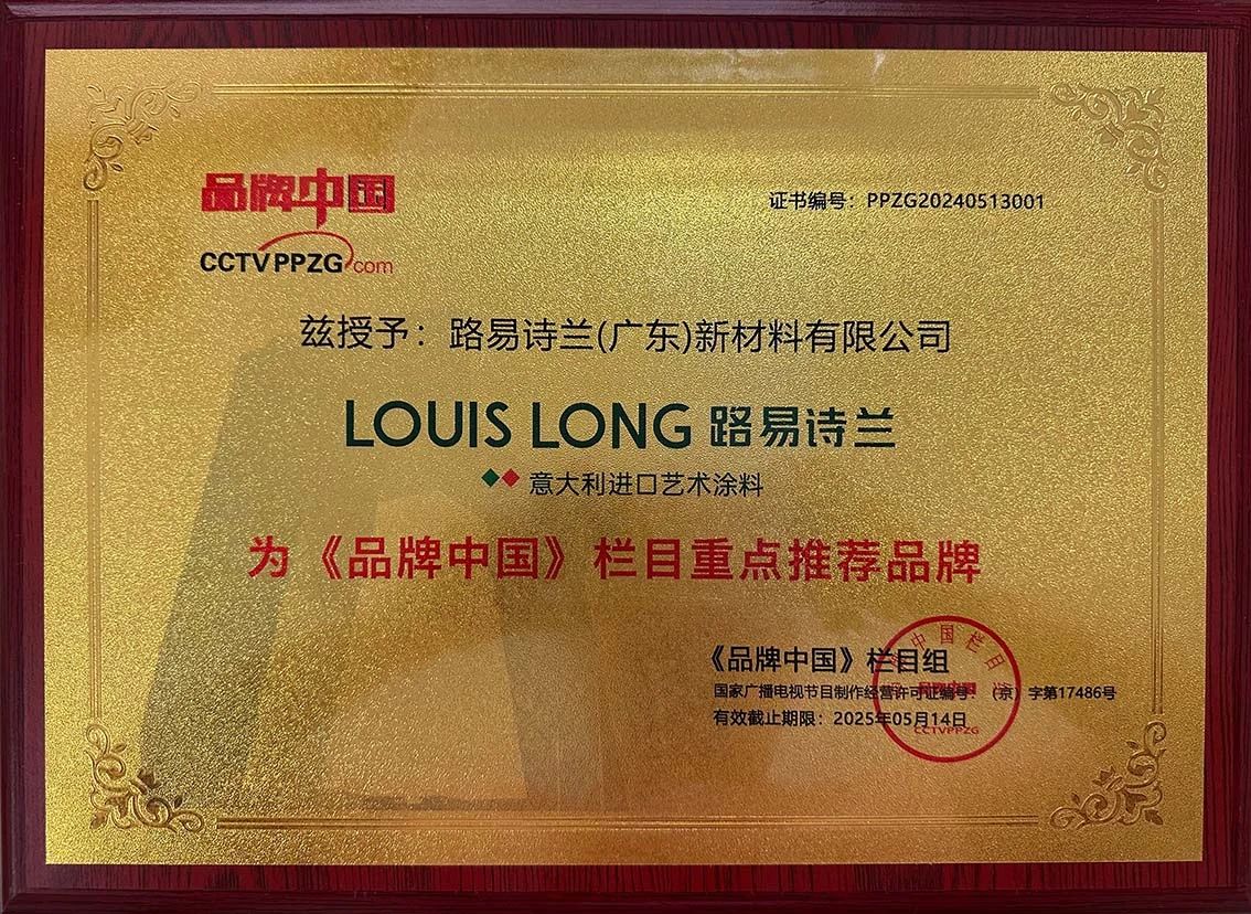 品牌中国授予路易诗兰为《品牌中国》栏目重点推荐品牌,同时授予路易诗兰艺术涂料行业“品牌中国工程”建设先锋品牌的荣誉称号。