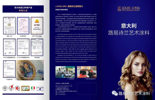 LOUIS LONG品牌诞生于十九世纪中叶,公司位于意大利艺术之都FERRARA。路易诗兰艺术漆以精致、典雅、高贵、浪漫温馨的装饰效果,深得消费者喜爱;其高超的艺术造诣、经典的时尚装饰在意大利享誉盛名!