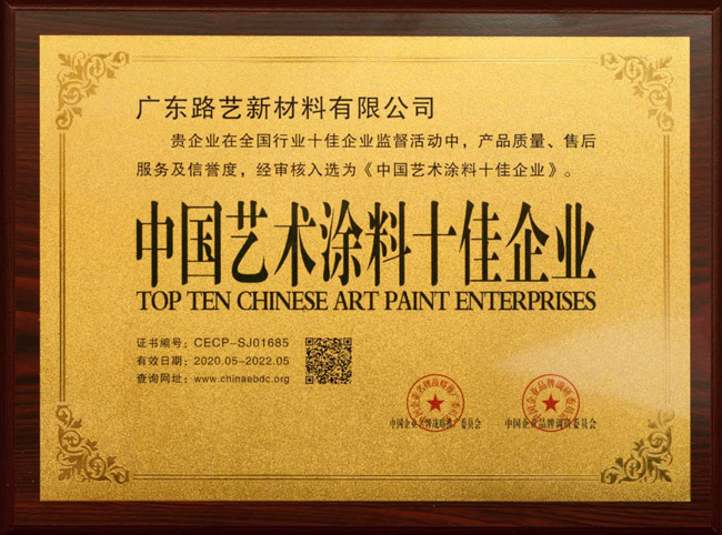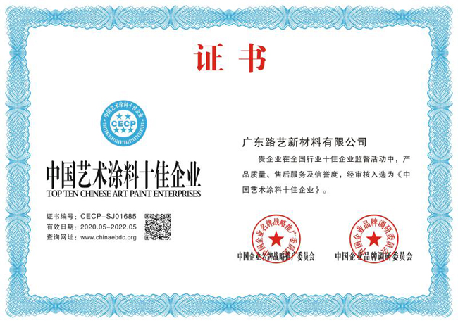 热烈祝贺广东路艺新材料有限公司获得“中国艺术涂料十佳企业”认证
