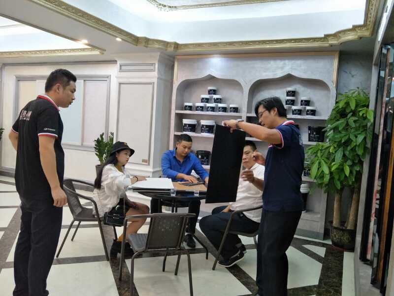 三位老板在大厅看了旋转样板、证书、包装及样板册、黑卡样板、色卡等,后续又参观了体验区并现场开罐看了产品。