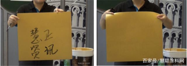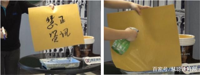 值得一提的是,我们评测人员同样是用沾了墨水的毛笔在涂层样板上进行书写,然后用喷壶喷水,可以看到墨水污迹随着水一起掉落到最后完全喷洗干净。评测发现这款艺术涂料的抗污、耐污性能都很不错,高效的抗污效果加上强有力的耐擦洗能力,可以让墙面持久保持干净亮丽,让消费者在日常清洁大扫除时省事省心省力。
