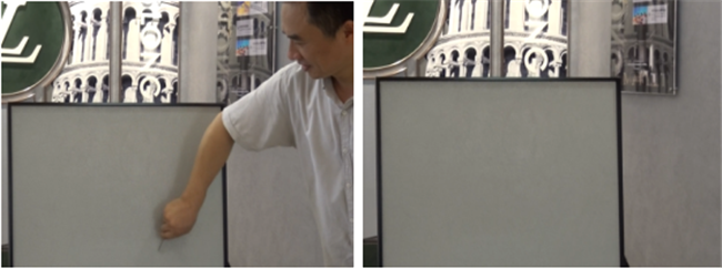 我们每天都会与墙面亲密接触,总免不了与生活污渍的碰撞,涂料的抗污性能就显得尤为重要。评测人员用沾了墨水的毛笔在涂层样板上进行书写,待字迹干透后用沾水的抹布进行擦拭。我们可以看到只需轻轻一擦,字迹就立刻被擦拭得无影无踪,耐沾污效果令人满意。