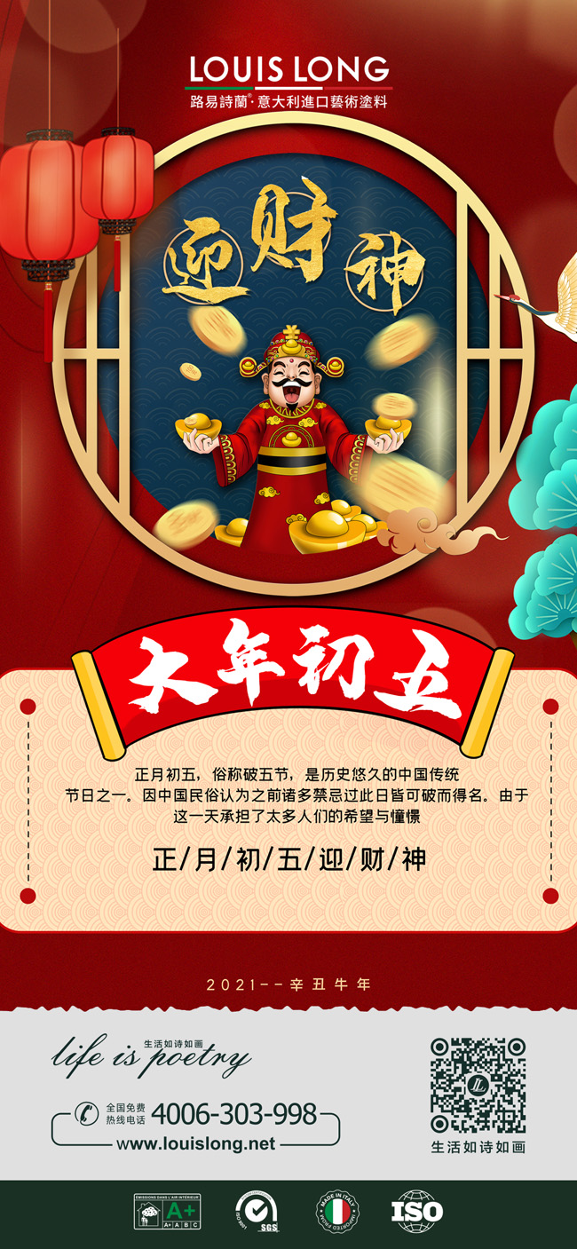 【路易诗兰2021新年祝福】正月初五迎财神,财源广进,五福临门!