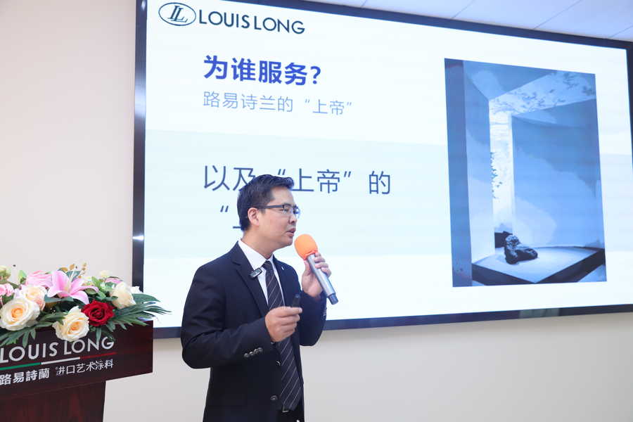 随后,顺德涂料商会秘书长张梦东对路易诗兰(华南)服务中心的成立表示祝贺,并从两个方面表达了个人对艺术涂料的理解,