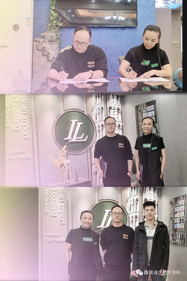 袁总经营软装设计公司十几年,有资深的设计师和施工团队,为了给客户提供更具市场优势的产品和更优质的服务,同时把家居设计的搭配和软装运用攻略做到更完美些。经仔细的考察后,了解到路易诗兰进口艺术涂料相对于其他同行业有着更齐全的产品种类,更好的品质保障、以及后续完整的产业服务链等品牌实力后,正式确认了合作意向,加入路易诗兰大家庭,成为浙江海宁地区的经销商。