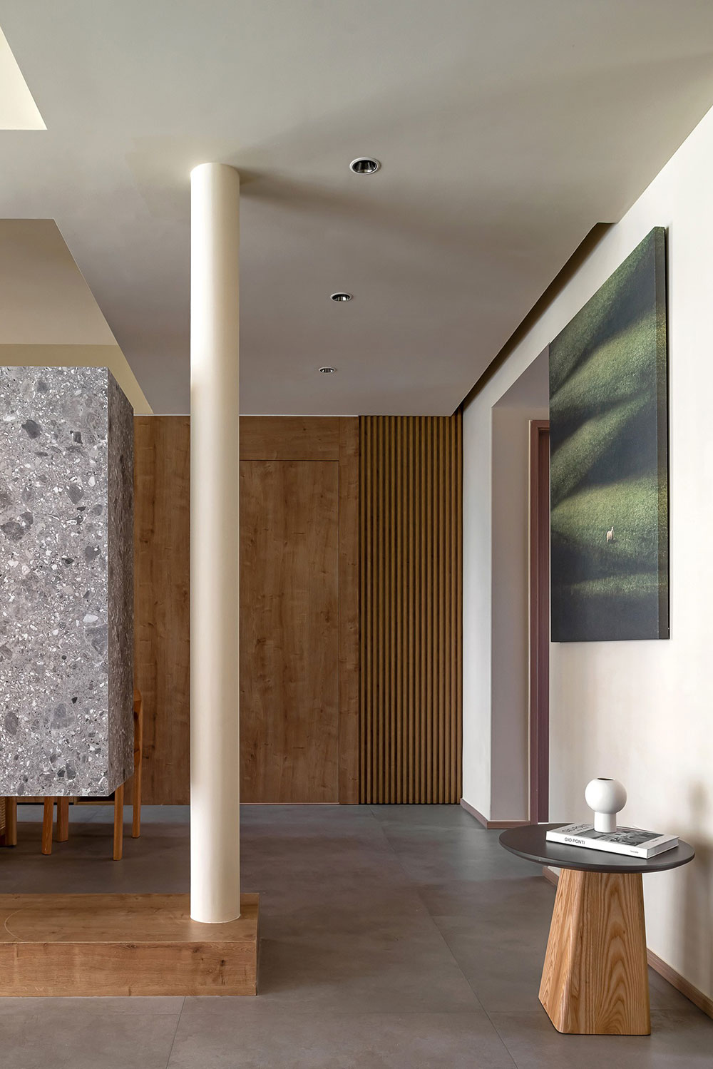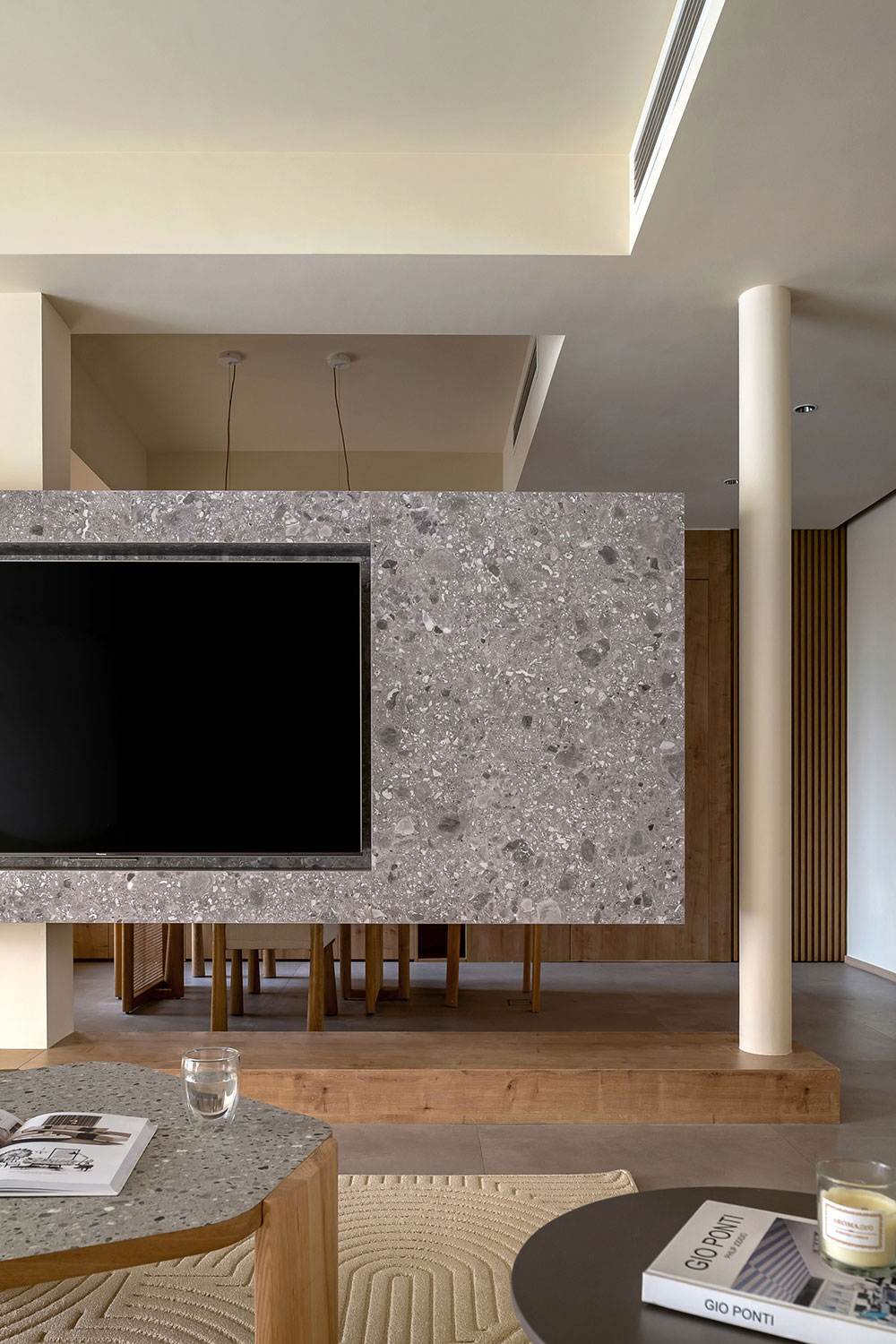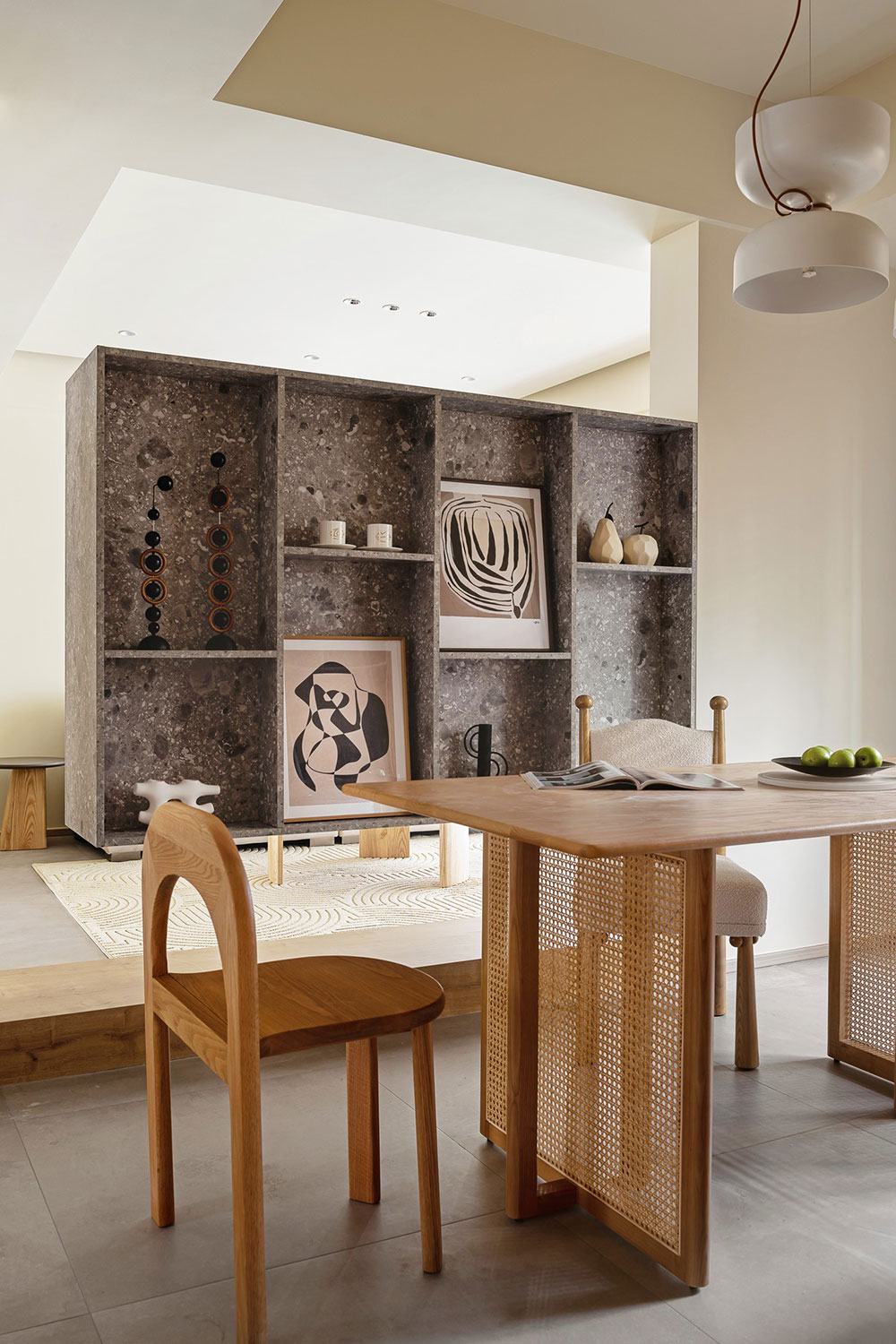 米黄色的天花与岩板式的背景墙相互衬托,彼此相融空间,一盏茶,一本书,一个下午。