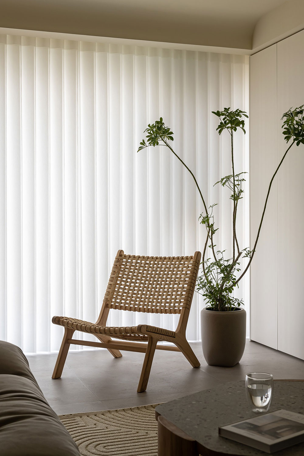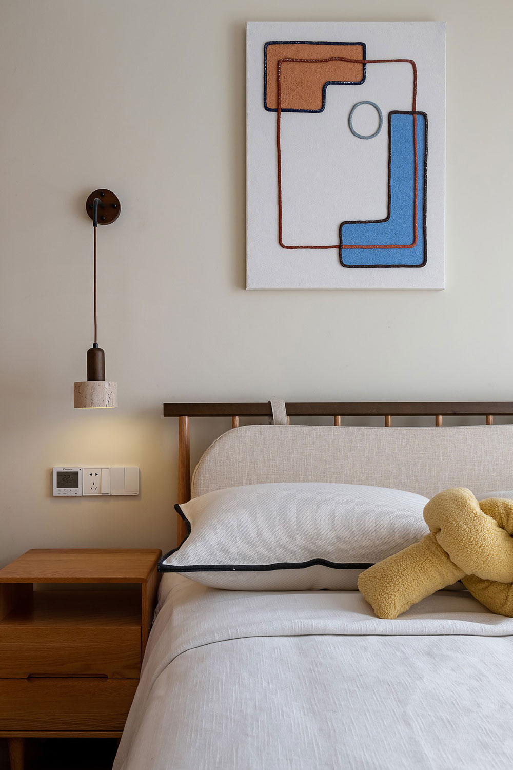 摒弃繁杂,简单的奶白艺术墙,搭配原木元素,温柔淡雅又凸显质感,给人温馨舒适的感觉。