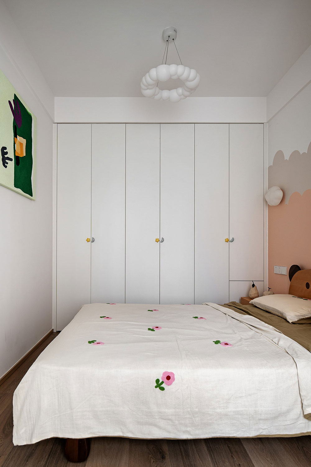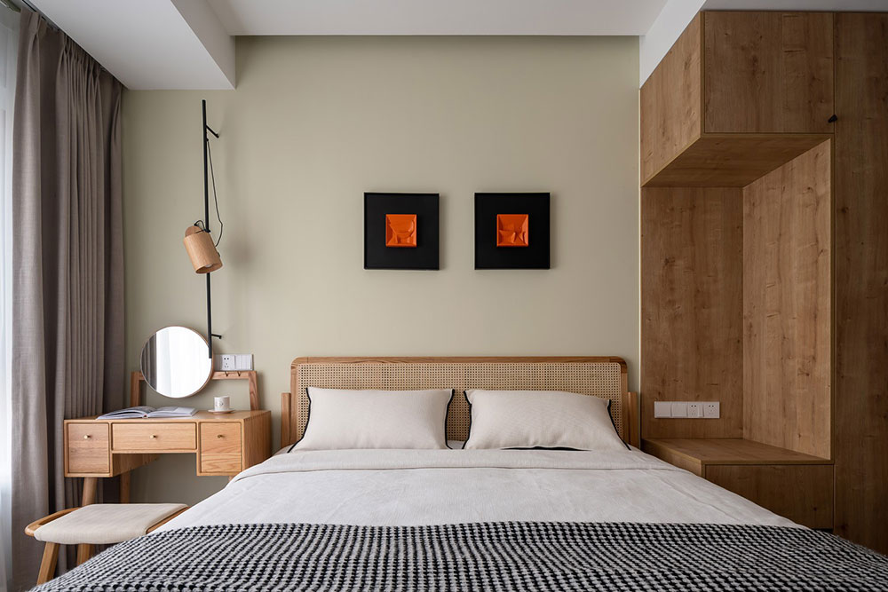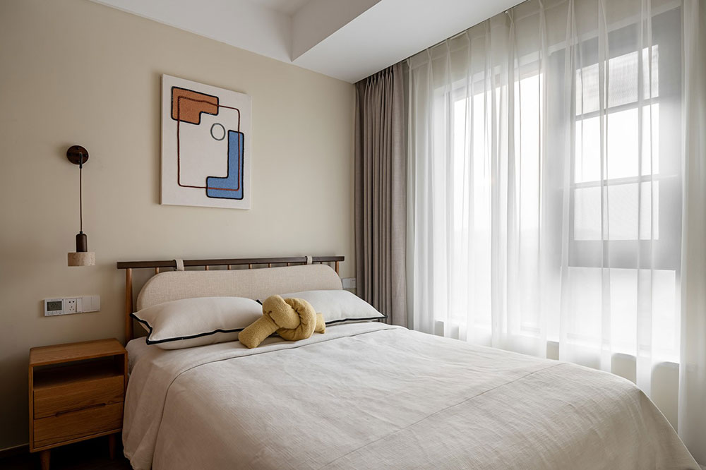 次卧也是功能性合理的空间,无需过多复杂的装饰,背景墙挂画增加色彩,简约舒适。