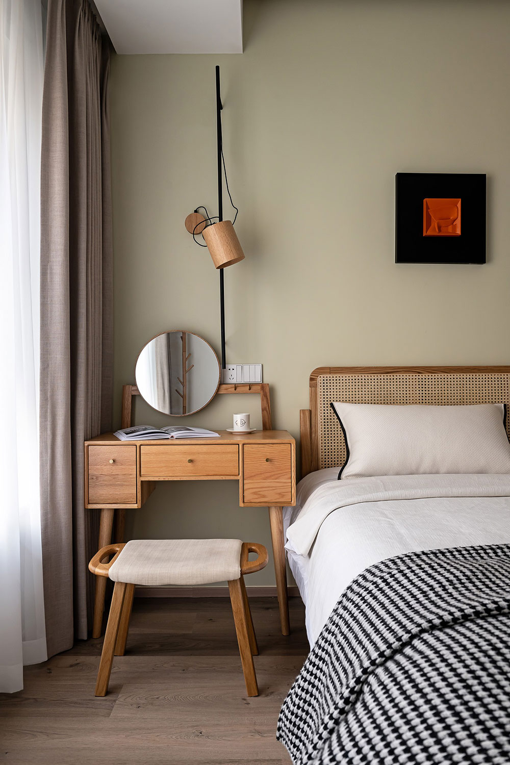暖色的墙面,简约温馨,原木系的床铺上白色床单,每天清晨在被窝中醒来,一旁的梳妆台,则是女屋主的专属基地。