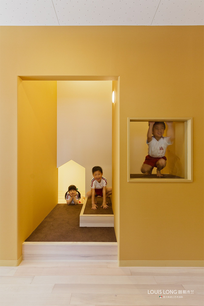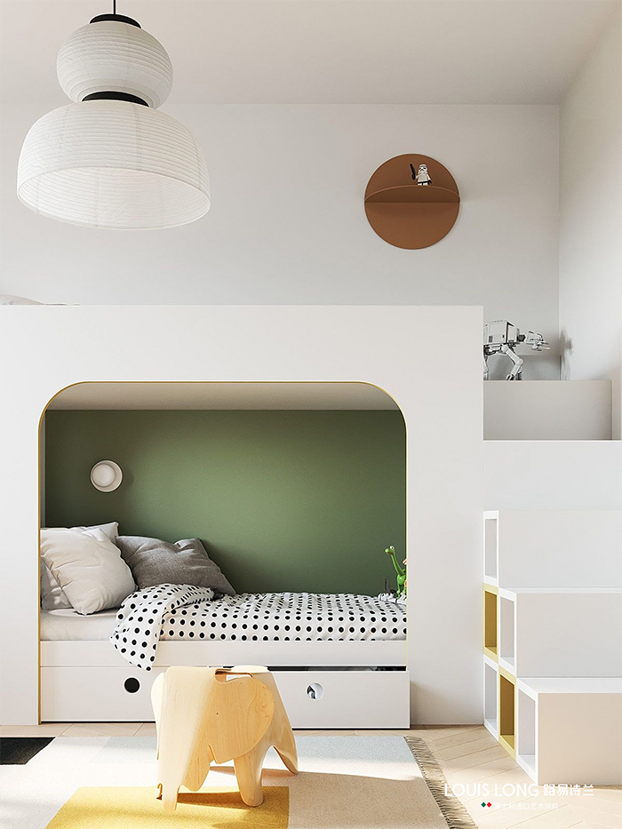 儿童房区域,大面积选择了软糯的奶黄色作为主色调。在窗帘及床品的选择上,也是以黄色系为主,再搭配上云朵造型的儿童床,整个空间都泡着可爱泡泡。