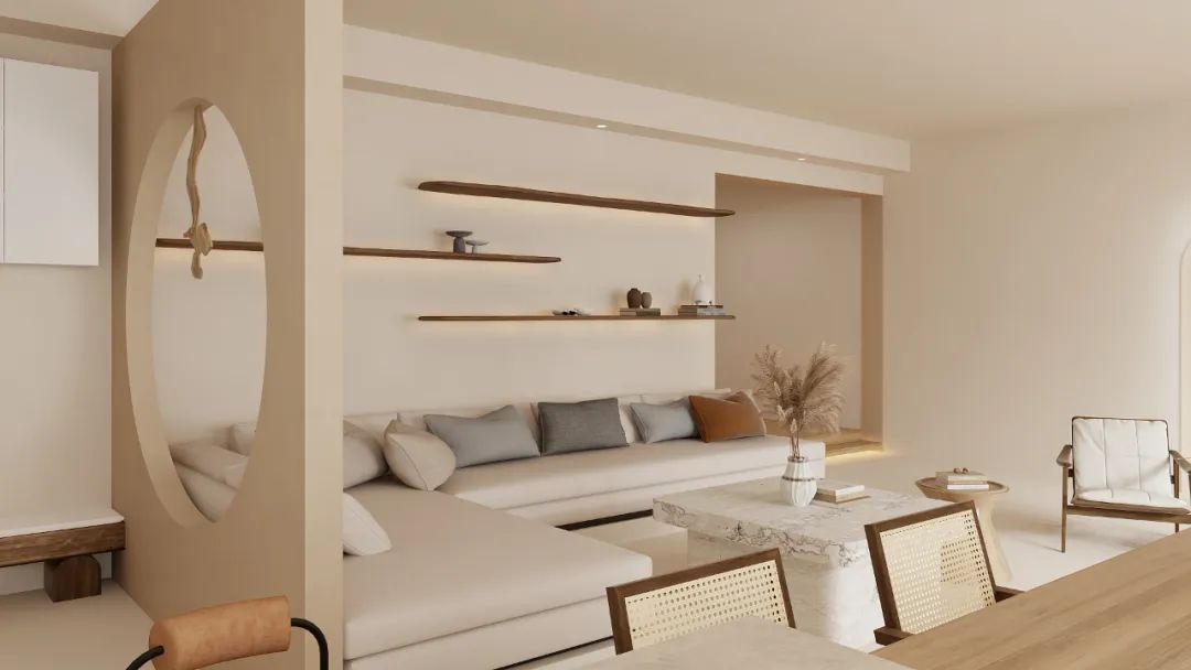 客厅整体采用质朴的浅色调,不张扬,不矫饰,彰显沉稳,呈现宁静雅致的氛围,唤醒人们对美好生活的憧憬,犹如亲临一场诗意绵绵的绮梦。