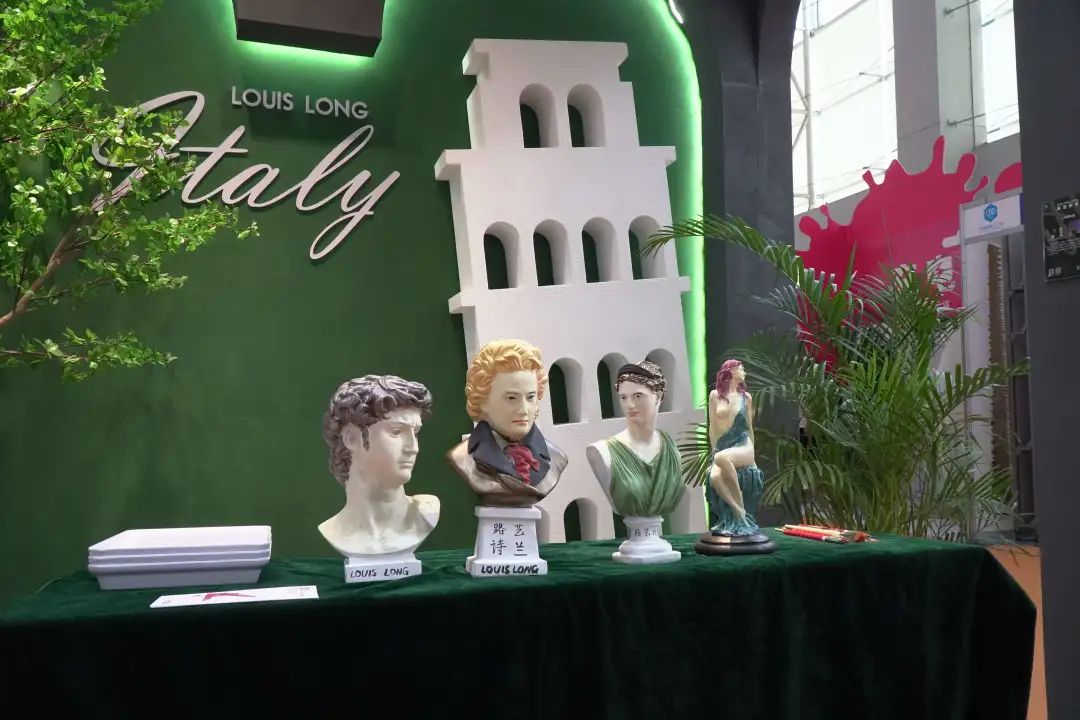 展厅的留影处,主体是一个简约版的比萨斜塔模型,比萨斜塔大家都不陌生,它曾经出现在我们小学的课本上,因其整个塔向一边倾斜而让我们牢牢记住它。简约比萨斜塔形成鲜明的意大利元素。同时,英文意大利字样做背景,配合绿植,希望它能成为你这次建博会上的经典打卡点。