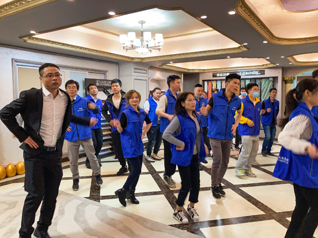 杨总带领着全体一起做活动,玩游戏游戏,跳着动感十足的舞蹈,喊出了响亮的口号:路易诗兰,一路向前,勇往直前,势不可挡,铁拳出击,力争第一;将现场气氛带上高潮!