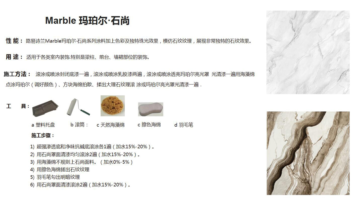 路易诗兰Marble玛珀尔·石尚系列涂料加上色彩及独特珠光效果,模仿石纹纹理,展现非常独特的石纹效果。