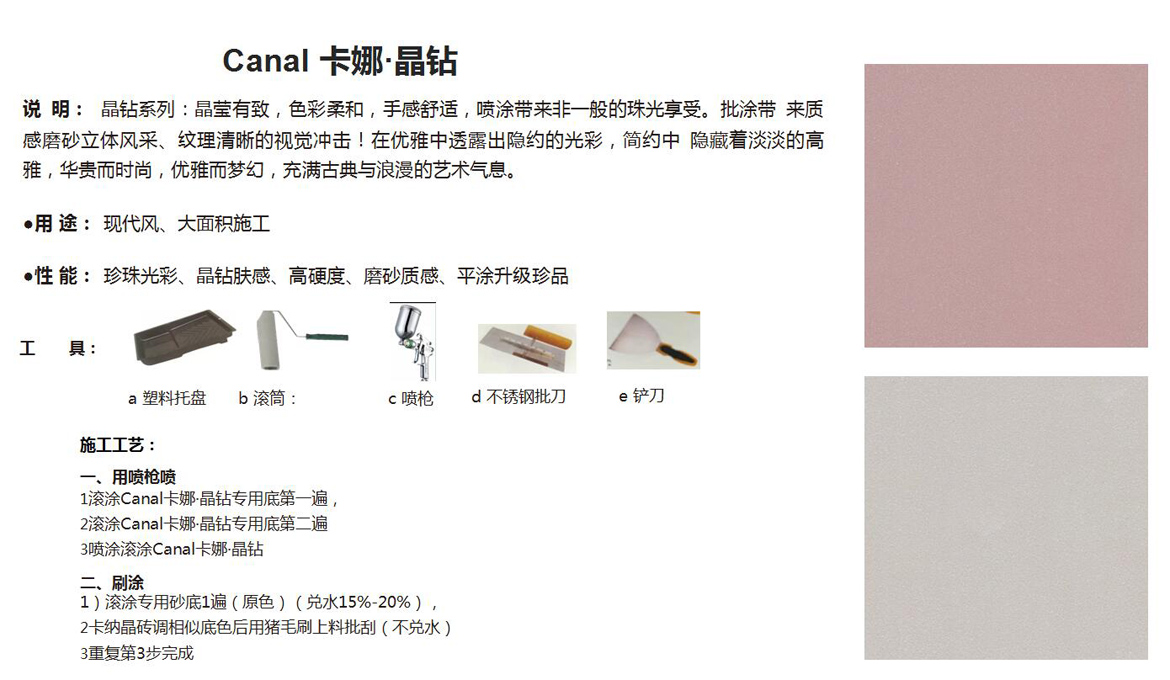 晶钻系列:晶莹有致,色彩柔和,手感舒适,喷涂带来非一般的珠光享受。批涂带 来质感磨砂立体风采、纹理清晰的视觉冲击!在优雅中透露出隐约的光彩,简约中 隐藏着淡淡的高雅,华贵而时尚,优雅而梦幻,充满古典与浪漫的艺术气息。